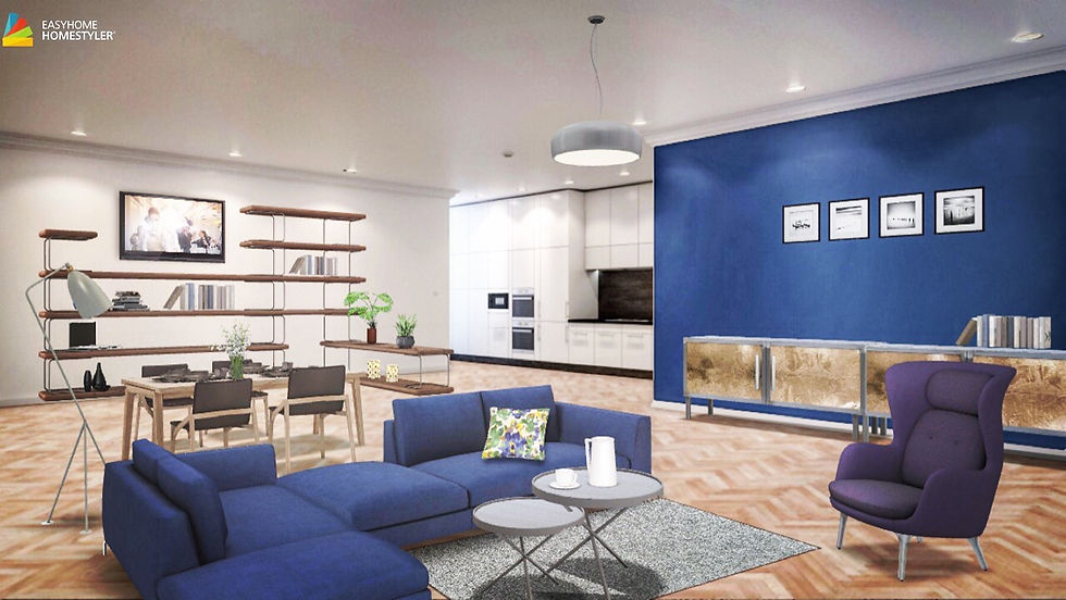 Tak jak wspominałam jest również duży, fioletowy uszak-fotel tak jakby dla przełamania. No cóż nie jestem do końca pewna czy pasuje do tego wnętrza, ale inspirowałam się różnymi rzeczami i nawet połączenie tych barw w modzie wydawało mi się trafione. Kuchnia klasycznie w bieli a salon z jadalnią, klasycznie w granacie. Delikatne wydzielenie stref tej przestrzeni za pomocą dużego regału i jeszcze większej, granatowej sofy.